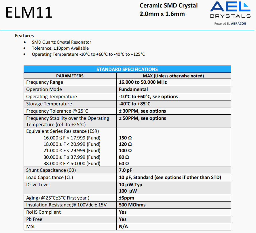 | ELM11-32.000MHz-10-R60-D1X-T | AEL Crystals | ELM11 | 32 MHz | ±20ppm | ±10ppm | 10 pF |