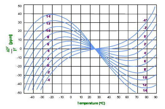 (圖2)是以AT切割角度變動在厚度振動模態的頻率對溫度特性的展開圖. 圖中以常用的室溫攝式25度作為相對零點, AT切割的最大優點是頻率對溫度變化為一元三次方曲線. 這個特性, 從(圖六)中可以看到, 在相當寬廣的溫度范圍下, AT切割的溫度曲線的第一階及第二階常數為零, 第三階的常數便決定了頻率對溫度的變化值.,
