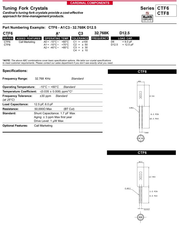 | CTF6-A1C2-32.768KD6 | Cardinal晶振 | CTF6 | 32.768kHz | 50 kOhm | -20°C ~ 70°C |