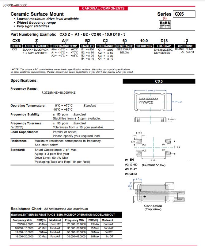 | CX5Z-A5B2C5-40-24.0D18 | Cardinal晶振 | CX5 | 24MHz | 40 Ohm | -20°C ~ 70°C |