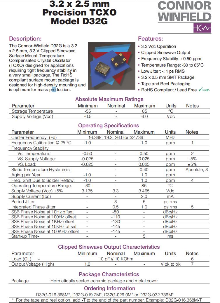 D32G-016.368M|6G模塊晶振|3225mm溫補晶振,ConnorWinfield晶振,D32G有源晶振,D32G-016.368M晶振,3225mm晶振,石英貼片晶振,溫度補償晶體振蕩器,頻率16.368MHz,電壓3.3V,工作溫度-30~85°C,頻率穩(wěn)定性0.5ppm,低抖動晶振,無鉛環(huán)保晶振,6G模塊晶振,北斗導航晶振,通信模塊晶振,儀器設備應用晶振.