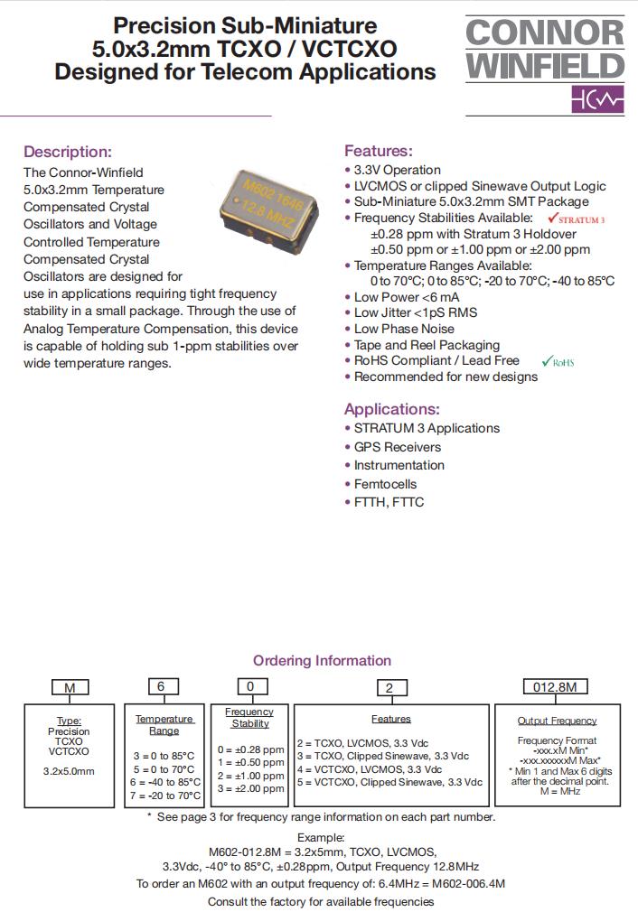 M602-012.8M,低相噪石英振蕩器,6G基站晶振,ConnorWinfield晶振,美國(guó)進(jìn)口晶振,M60有源晶振,M602-012.8M晶振,5032mm晶振,低相噪晶振,石英晶體振蕩器,頻率12.8MHz,電壓3.3V,工作溫度-40~85°C,頻率穩(wěn)定性0.28ppm,低抖動(dòng)晶振,低功耗晶振,6G基站晶振,GPS接收器晶振,儀器儀表應(yīng)用晶振,Femtocells晶振,FTTH晶振.