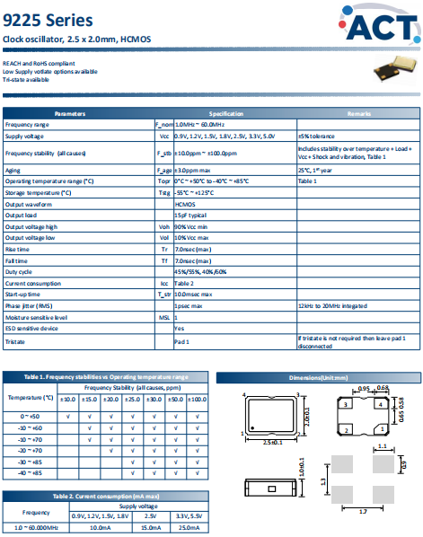 ACT晶振,9225晶振,普通有源晶振.有源晶振,是只晶體本身起振需要外部電壓供應(yīng),起振后可直接驅(qū)動(dòng)CMOS 集成電路,產(chǎn)品本身已實(shí)現(xiàn)與薄型IC(TSSOP封裝,TVSOP封裝)同樣的1mm厚度,斷開時(shí)的消費(fèi)電流是15 µA以下,編帶包裝方式可對(duì)應(yīng)自動(dòng)搭載及IR回流焊接(無(wú)鉛對(duì)應(yīng))產(chǎn)品有幾種電壓供選1.8V,2.5V,3V3.3V,5V,以應(yīng)對(duì)不同IC產(chǎn)品需要.