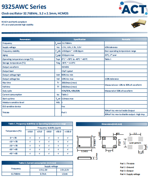 ACT晶振,9325AWC晶振,石英晶體振蕩器.3225mm體積的晶振,可以說是目前小型數碼產品的福音,目前超小型的智能手機里面所應用的就是小型的石英晶振,該產品最適用于無線通訊系統,無線局域網,已實現低相位噪聲,低電壓,低消費電流和高穩定度,超小型,質量輕等產品特點,產品本身編帶包裝方式,可對應自動高速貼片機應用,以及高溫回流焊接(產品無鉛對應),為無鉛產品.