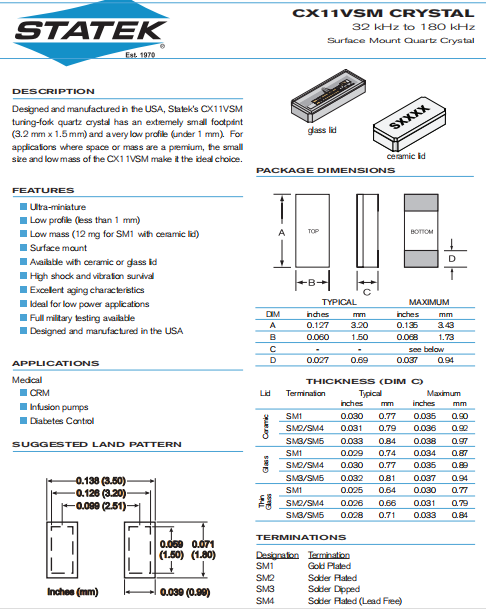 1970年,Statek晶振公司開創(chuàng)了石英計(jì)時(shí)元件小型化技術(shù),革新了頻率控制行業(yè).今天,Statek進(jìn)口晶振在設(shè)計(jì)和制造超微型石英晶體,振蕩器和傳感器方面延續(xù)了創(chuàng)新的傳統(tǒng).自成立以來,Statek一直是創(chuàng)新,服務(wù)和質(zhì)量的代名詞.所有產(chǎn)品都是在美國設(shè)計(jì)制造和測試的.