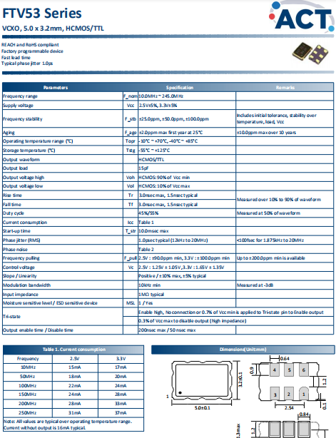 ACT晶振,FTV53晶振,VCXO晶體振蕩器.小型SMD有源晶振,從最初超大體積到現在的7050mm,6035mm,5032mm,3225mm,2520mm體積,有著翻天覆地的改變,體積的變小也使產品帶來了更高的穩定性能,接縫密封石英晶體振蕩器,精度高,覆蓋頻率范圍寬的特點,SMD高速自動安裝和高溫回流焊設計,Optionable待機輸出三態輸出功能,電源電壓范圍:1.8V?5 V,高穩定性,低抖動,低功耗,主要應用領域:無線通訊,高端智能手機,平板筆記本WLAN,藍牙,數碼相機,DSL和其他IT產品的晶振應用,三態功能,PC和LCDM等高端數碼領域,符合RoHS/無鉛.