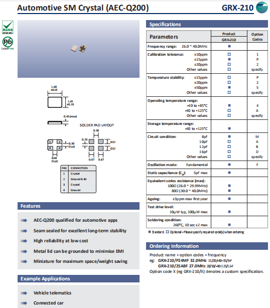 Golledge晶振,GRX-210晶振,高質(zhì)量石英晶體.小型貼片石英晶振,外觀尺寸具有薄型表面貼片型石英晶體諧振器,特別適用于有小型化要求的市場(chǎng)領(lǐng)域,比如智能手機(jī),無線藍(lán)牙,平板電腦等電子數(shù)碼產(chǎn)品.晶振本身超小型,薄型,重量輕,晶體具有優(yōu)良的耐環(huán)境特性,如耐熱性,耐沖擊性,在辦公自動(dòng)化,家電相關(guān)電器領(lǐng)域及Bluetooth,WirelessLAN等短距離無線通信領(lǐng)域可發(fā)揮優(yōu)良的電氣特性,滿足無鉛焊接的回流溫度曲線要求.