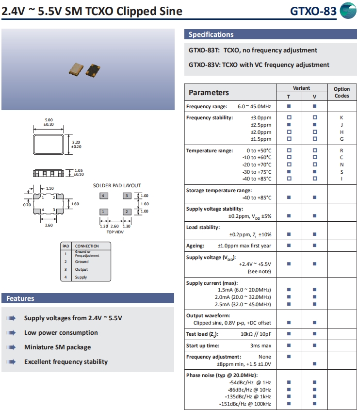 Goliedge晶振,GTXO-83晶振,溫補晶振.5032mm體積的石英晶體振蕩器有源晶振,改產品可驅動2.5V的溫補晶振,壓控晶振,VC-TCXO晶體振蕩器產品,電源電壓的低電耗型,編帶包裝方式,可對應自動高速貼片機自動焊接,及IR回流焊接(無鉛對應),為無鉛產品,超小型,質地輕.產品被廣泛應用到集成電路,程控交換系統,無線發射基站.