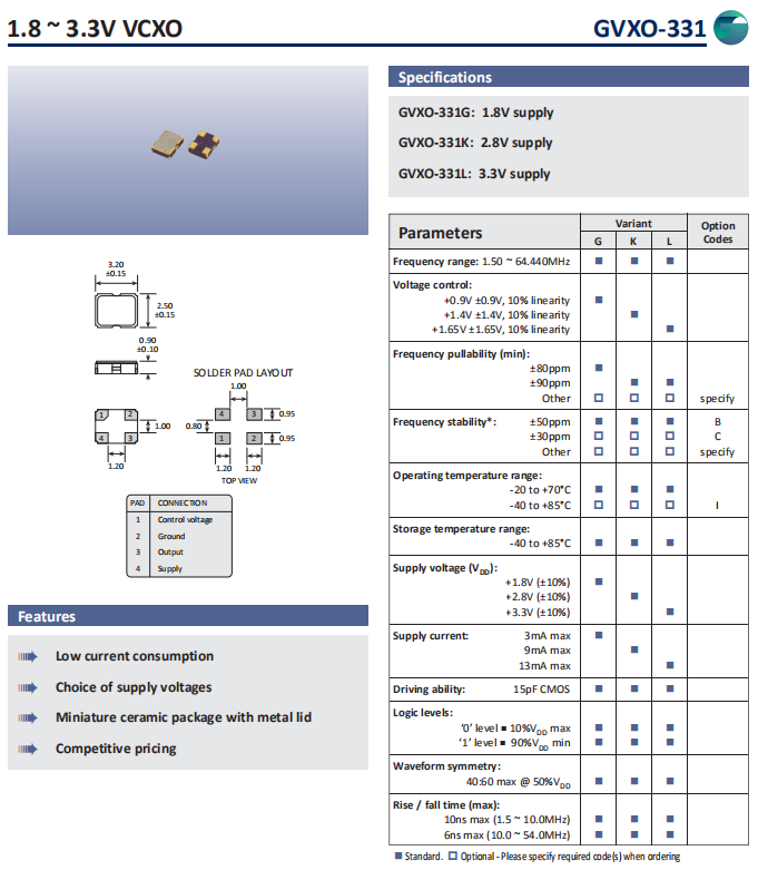 Golledge晶振,GVXO-331晶振,壓控晶體振蕩器.壓控晶振(VCXO)壓控石英晶體振蕩器基本解決方案,PECL輸出,輸出頻率60MHz到200MHz之間,出色的低相位噪聲和抖動,三態功能,應用:SDH/SONET,以太網,基站,筆記本晶振應用,符合RoHS/無鉛.