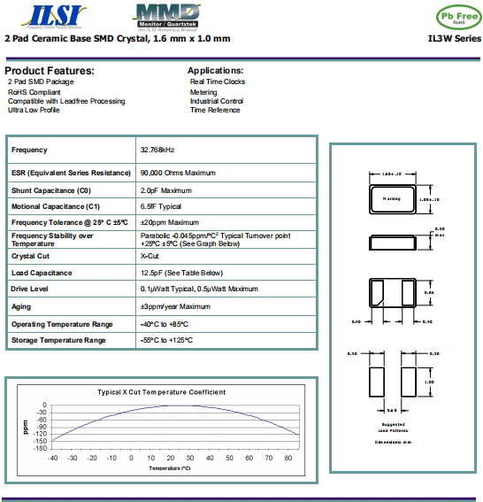 ILSI晶振,IL3W晶振,石英晶體諧振器.32.768K系列具有超小型,薄型,質(zhì)地輕的表面貼片音叉型石英晶體諧振器,晶振產(chǎn)品本身具備優(yōu)良的耐熱性,耐環(huán)境特性,在辦公自動(dòng)化,家電領(lǐng)域,移動(dòng)通信領(lǐng)域可發(fā)揮優(yōu)良的電氣特性,符合無(wú)鉛標(biāo)準(zhǔn),滿足無(wú)鉛焊接的回流溫度曲線要求,金屬外殼的石英晶振使得產(chǎn)品在封裝時(shí)能發(fā)揮比陶瓷晶振外殼更好的耐沖擊性能.