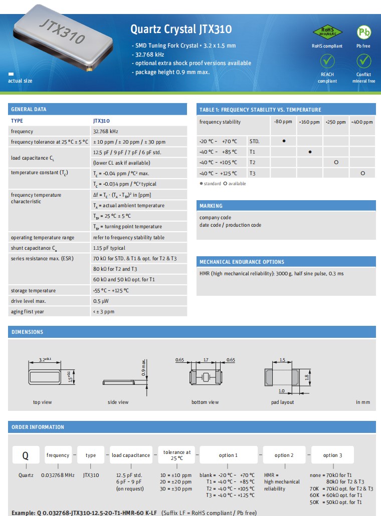 JAUCH晶振,JTX310晶振,壓電石英晶體.貼片表晶32.768K系列具有超小型,薄型,質地輕的表面貼片音叉型石英晶體諧振器,晶振產品本身具備優良的耐熱性,耐環境特性,在辦公自動化,家電領域,移動通信領域可發揮優良的電氣特性,符合無鉛標準,滿足無鉛焊接的回流溫度曲線要求,金屬外殼的石英晶振使得產品在封裝時能發揮比陶瓷晶振外殼更好的耐沖擊性能.