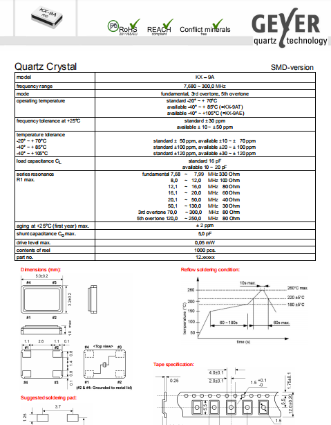 Geyer晶振,KX-9A晶振,高精度晶振.普通貼片石英晶振外觀使用金屬材料封裝的,具有高穩定性,高可靠性的石英晶體諧振器,晶振外觀本身使用金屬封裝,充分的密封性能,可確保其高可靠性,采用編帶包裝,外包裝采用朔膠盤,可在自動貼片機上對應自動貼裝等優勢.