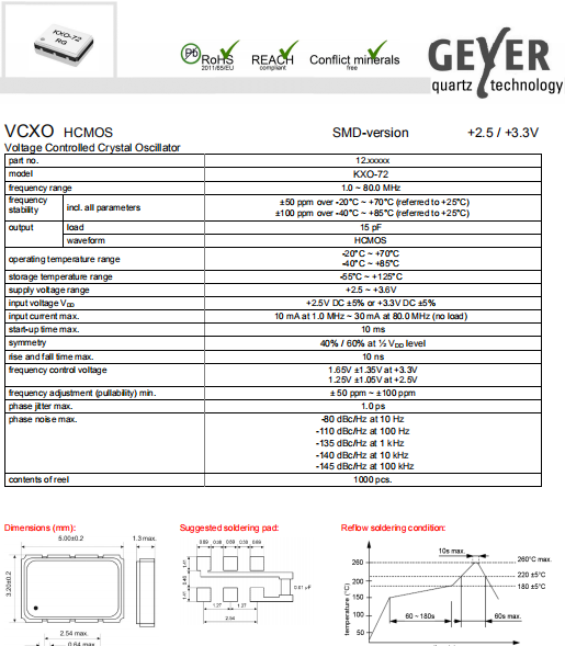 Geyer晶振,KXO-72晶振,環(huán)保振蕩器.VCXO晶振具有最適合于移動(dòng)通信設(shè)備用途的高穩(wěn)定的頻率溫度特性.為對(duì)應(yīng)低電源電壓的產(chǎn)品.(可對(duì)應(yīng)DC +1.8 V±0.1 V to +3.2 V±0.1 V )高度:最高1.0 mm,體積:0.007 cm3,重量:0.024g,超小型,輕型.低消耗電流,表面貼片型產(chǎn)品.(可對(duì)應(yīng)回流焊) 無鉛產(chǎn)品.滿足無鉛焊接的回流溫度曲線要求.