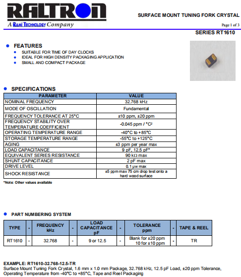 Raltron晶振,RT1610晶振,32.768K無源晶振.普通貼片石英晶振外觀使用金屬材料封裝的,具有高穩定性,高可靠性的石英晶體諧振器,晶振外觀本身使用金屬封裝,充分的密封性能,可確保其高可靠性,采用編帶包裝,外包裝采用朔膠盤,可在自動貼片機上對應自動貼裝等優勢.