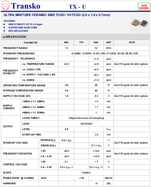 Transko晶振,TX-U晶振,溫度補(bǔ)償晶振.貼片晶振本身體積小,超薄型石英晶體振蕩器,特別適用于有目前高速發(fā)展的高端電子數(shù)碼產(chǎn)品,因?yàn)榫д癖旧硇⌒突枨蟮氖袌鲱I(lǐng)域,小型,薄型是對應(yīng)陶瓷振蕩器(偏差大)和普通的石英晶體振蕩器(偏差小)的中間領(lǐng)域的一種性價比較出色的產(chǎn)品.產(chǎn)品廣泛用于筆記本電腦,無線電話,衛(wèi)星導(dǎo)航HDD, SSD, USB, Blu-ray等用途,符合無鉛焊接的高溫回流焊曲線特性.
