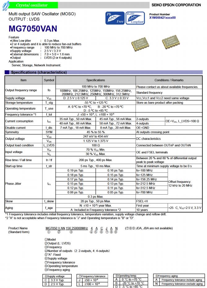 | X1M0004210012 | MG7050VAN | 156.250000 MHz | 7.00 x 5.00 x 1.60 mm | LVDS | 2.970 to 3.630 V |