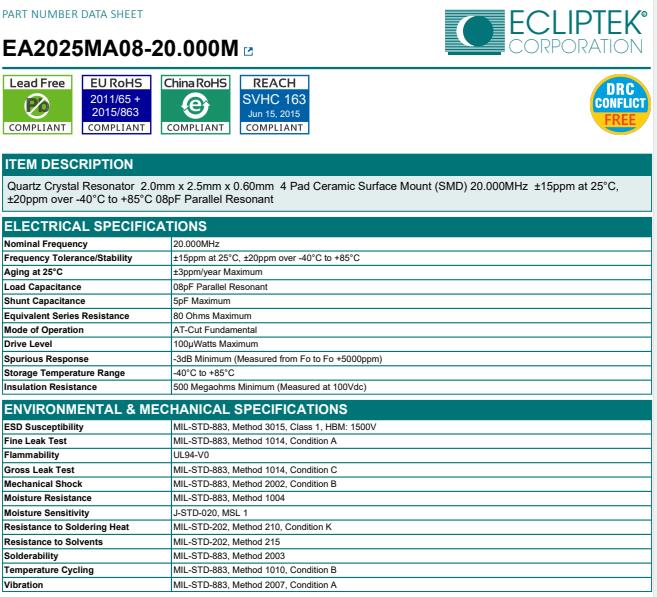所有石英晶體諧振器和實(shí)時(shí)時(shí)鐘模塊都以IC形式提供.ECLIPTEK日蝕晶振,EA2025MA08-20.000M晶振,低損耗晶振.