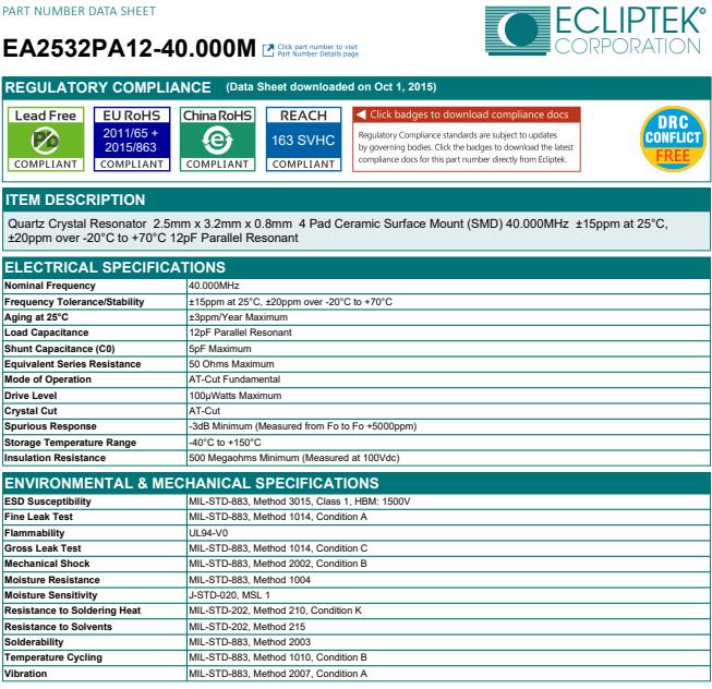 ECLIPTEK晶振,EA2532PA12-40.000M晶振,3225mm貼片晶振,超小型表面貼片型SMD晶振,最適合使用在汽車電子領(lǐng)域中,也是特別要求高可靠性的引擎控制用CPU的時(shí)鐘部分.低頻晶振可從7.98MHz起對應(yīng),小型,超薄型具備強(qiáng)防焊裂性,石英晶體在極端嚴(yán)酷的環(huán)境條件下也能發(fā)揮穩(wěn)定的起振特性,產(chǎn)品本身具有耐熱,耐振,耐撞擊等優(yōu)良的耐環(huán)境特性,滿足無鉛焊接以及高溫回流溫度曲線要求,符合AEC-Q200標(biāo)準(zhǔn).