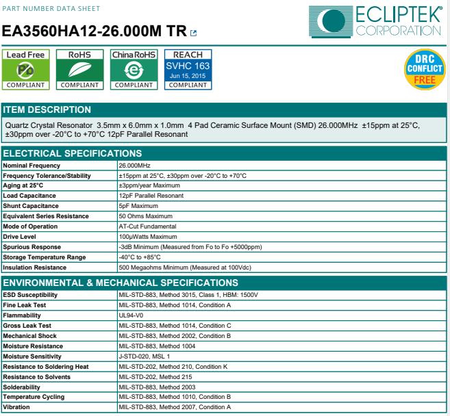 日蝕美國(guó)晶振,EA3560HA12-26.000M-TR無(wú)線通信晶振,6035mm無(wú)源晶體,我們的網(wǎng)站是為了幫助客戶確定黃華產(chǎn)品的RoHS和pb免費(fèi)狀態(tài)。我們的RoHS/pbfree認(rèn)證和IPC-1752材料聲明工具為我們的客戶提供了按零件編號(hào)處理他們的文檔請(qǐng)求的能力,并在幾秒鐘內(nèi)收到一個(gè)全面的自動(dòng)回復(fù)。