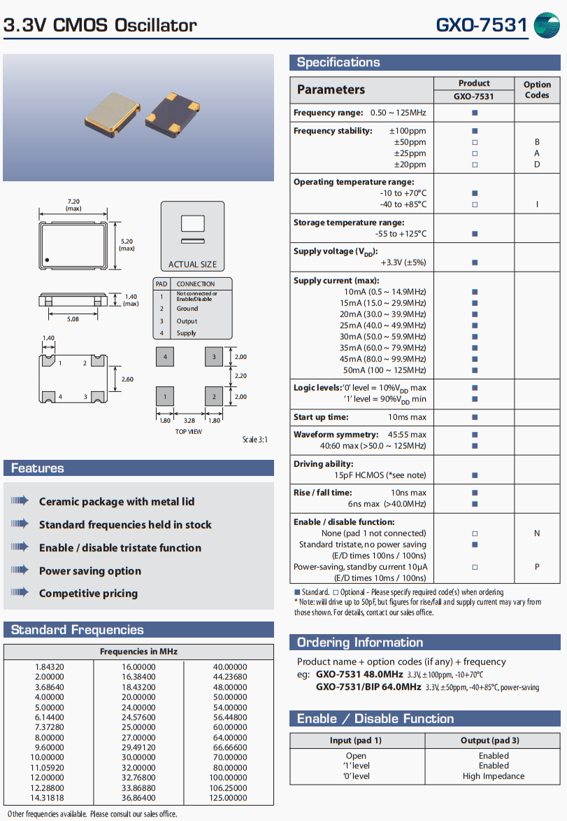 高利奇低損耗有源晶振,無線充電器晶振,GXO-7531/I 25.0MHz晶振