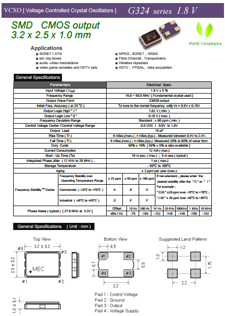 MERCURY晶體,壓控晶體振蕩器,G324晶振.有源晶振,是只晶體本身起振需要外部電壓供應,起振后可直接驅動CMOS 集成電路,產品本身已實現與薄型IC(TSSOP封裝,TVSOP封裝)同樣的1mm厚度,斷開時的消費電流是15 µA以下,編帶包裝方式可對應自動搭載及IR回流焊接(無鉛對應)產品有幾種電壓供選.