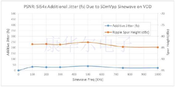 下圖顯示了Ultra系列抖動性能與工作頻率和溫度的關系.有兩種性能等級.Si545/6/7器件可提供典型值為80fsRMS(12kHz至20MHz)的相位抖動性能,而Si540/1/2晶振可提供典型值為125fs RMS(12kHz至20MHz)的抖動性能.鑒于其抖動性能,Si54x使抖動容限最大化,并使客戶放心設計. 集成電源噪聲調節: