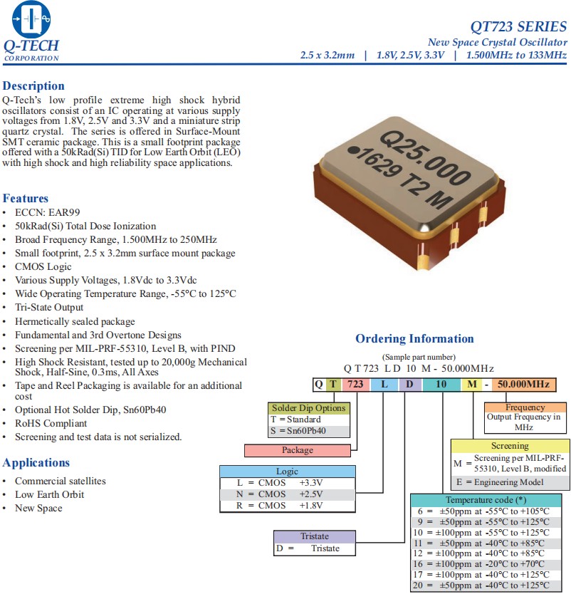QT723LD12M-52.000MHz,3225mm貼片晶振,6G基站晶振, Q-Tech晶振,歐美進(jìn)口晶振,QT723石英晶體振蕩器,QT723LD12M-52.000MHz有源晶振,3225mm小尺寸晶振,SMD晶振,頻率52MHz,電壓3.3V,工作溫度-40~85°C,頻率穩(wěn)定性100ppm,耐高溫晶振,抗沖擊晶振,6G基站晶振,商業(yè)衛(wèi)星應(yīng)用晶振,低地球軌道應(yīng)用晶振,新空間應(yīng)用晶振.