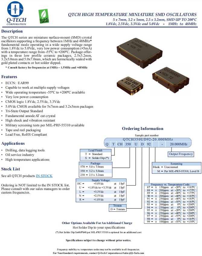 QTCH230LD92-32.000MHz|3225mm高溫應用晶振|Q-Tech美國晶振 參數表