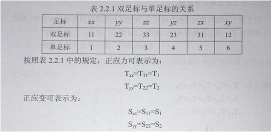 沿x方向應力和y方向應力的特點是,力的方向與作用面垂直(或力的方向與作用面的法線方向平行)。為了反應這兩個方向在應力符號上要附加兩個足標,例如Tx和Ty。應力的第一個足標表示力的方向,第二個足標表示作用面的法線方向。同理,應變也有兩個足標,例如Sx和Sy應變的第一個足標表示原長度的方向,第二個足標表示伸長量的方向,Tx、Ty又稱正應力(或伸縮應力),Sx、Sy又稱為正應變(或伸縮應變)為了簡便,通常將足標中的(x,y,z)用(1,2,3)表示,而且將雙足標簡化為單足標,雙足標與單足標的關系如表2.2.1所示。
