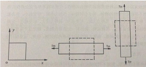 如圖2.2.1(a)所示的小方片,當它受到x方向的應力作用時,除在x方向產生伸長外,同時在y方向也產生收縮,如圖2.2.1(b)所示。同樣,當小方片受到y方向的應力作用時,除了在y方向產生伸長外,同時在x方向也產生收縮