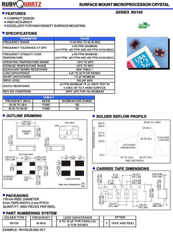 RH100水晶振動子,盧柏進口晶振,RH100-26.000-18-T無源諧振器,超小型表面貼片型SMD晶振,最適合使用在汽車電子領域中,也是特別要求高可靠性的引擎控制用CPU的時鐘部分.低頻晶振可從7.98MHz起對應,小型,超薄型具備強防焊裂性,石英晶體在極端嚴酷的環(huán)境條件下也能發(fā)揮穩(wěn)定的起振特性,產品本身具有耐熱,耐振,耐撞擊等優(yōu)良的耐環(huán)境特性,滿足無鉛焊接以及高溫回流溫度曲線要求,符合AEC-Q200標準.