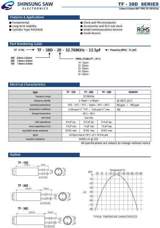 SHINSUNG新松晶振,TF-38D插件晶振,TF-38D-25-32.768KHz-12.5pF晶振,SHINSUNG Crysta成立于1990年,并開始生產石英晶振,濾波器,石英晶體振蕩器,同時向客戶提供最新的新松貼片石英晶振或通孔型晶振單元,時鐘有源晶振,溫補晶振等晶振產品,一直以供應優質晶振產品為信念,不斷給社會創造價值.