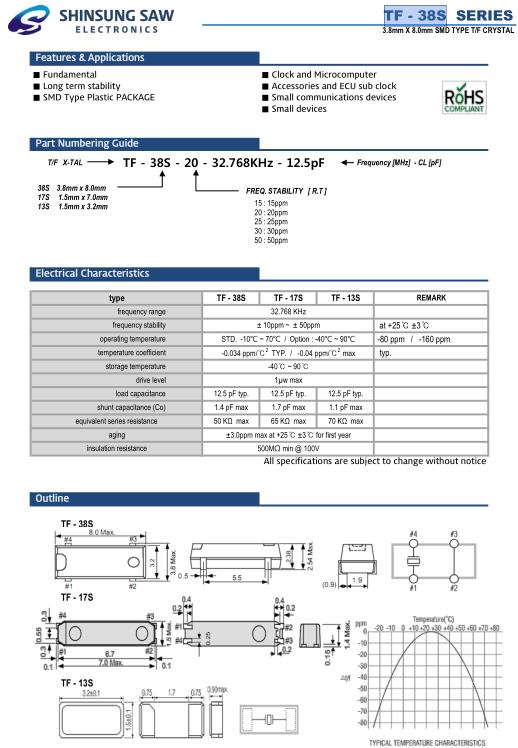 韓國新松晶振,TF-38S貼片晶振,TF-38S-25-32.768KHz-12.5pF晶振,32.768K時鐘晶體具有小型,薄型,輕型的貼片晶振表面音叉型晶體振蕩器,產(chǎn)品具有優(yōu)良的耐熱性,耐環(huán)境特性,可發(fā)揮晶振優(yōu)良的電氣特性,符合RoHS規(guī)定,滿足無鉛焊接的高溫回流溫度曲線要求,金屬外殼的封裝使得產(chǎn)品在封裝時能發(fā)揮比陶瓷振蕩器外殼更好的耐沖擊性.