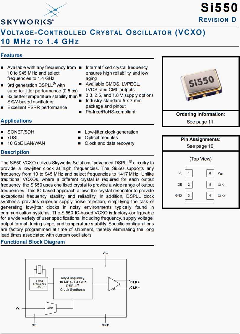 | Skywork原廠編碼 | 生產商 | 型號 | 類型 | 頻率 | 輸出 | 電源電壓 | 頻率穩定度 |