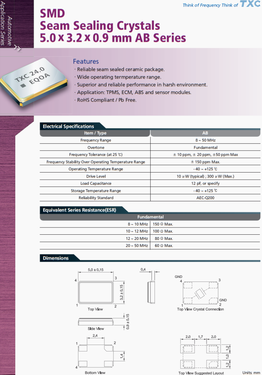 車載藍牙晶振,TXC無源晶振,AB-19.680MALE-T晶振,AB系列SMD,縫封晶體,5.0* 3.2* 0.9 mm ,特點,可靠的縫封陶瓷封裝。工作溫度范圍寬。惡劣環境下性能優越可靠。應用范圍:TPMS, ECM, ABS,傳感器模塊。符合rohs標準/不含鉛臺灣TXC晶振公司,晶技晶振,無源晶振,5032晶振,AB-19.680MALE-T晶振,汽車晶振,汽車電動天窗控制系統晶振,臺灣晶振,貼片晶振,四腳晶振,石英晶振,進口晶振,高品質晶振,車載多媒體晶振,行車記錄儀晶振,低損耗晶振,耐高溫晶振,耐沖擊晶振。