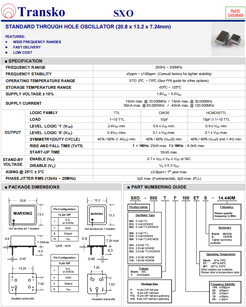 SXO-510TF50ET-16.000M,歐美Transko鐘振,6GWIFI應(yīng)用晶振參數(shù)表