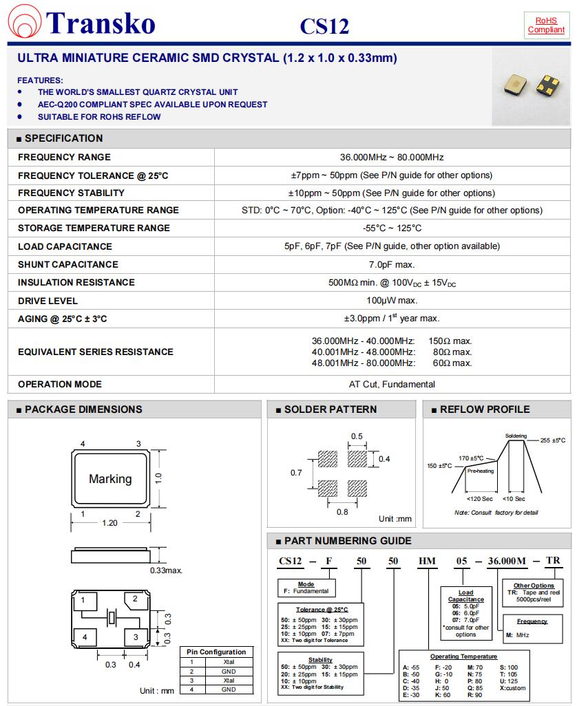 Transko晶振,CS12-F1020CQ06-20.000M-TR,6G無線應用晶振參數表