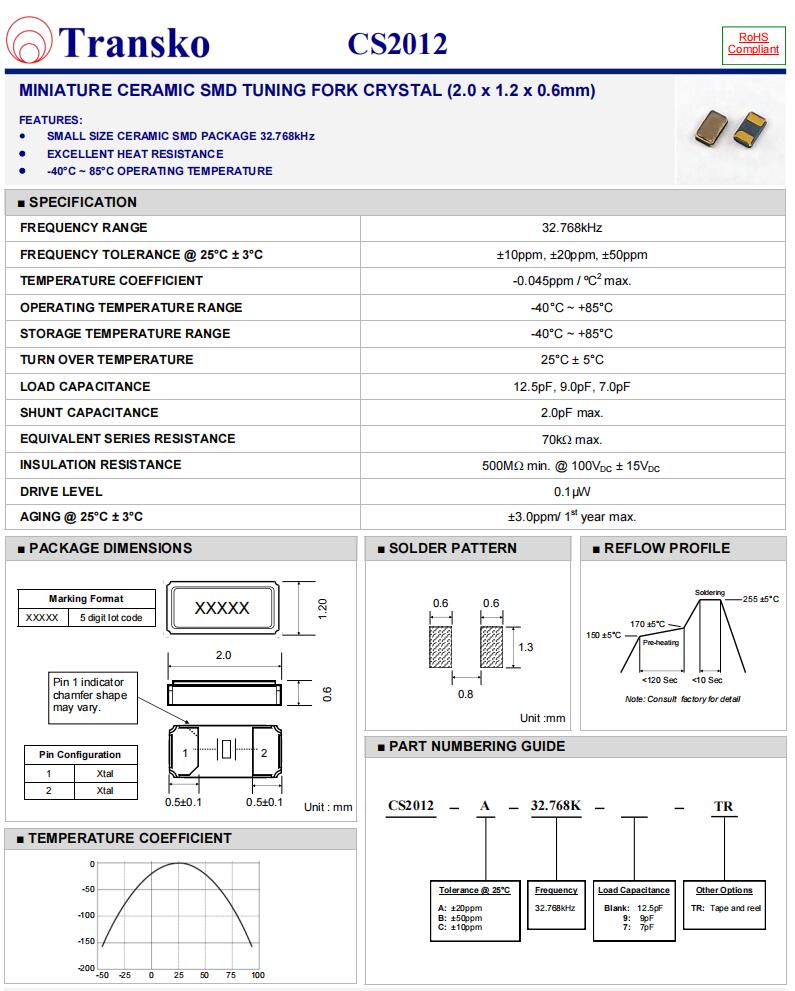 Transko晶振|CS2012-A-32.768K-TR|2012mm|6G光纖通道晶振,Transko晶振,CS2012石英晶體諧振器,二腳貼片晶振,CS2012-A-32.768K-TR晶振,2012mm晶振,32.768KHz音叉晶體,負(fù)載12.5pF,工作溫度-40~85°C,頻率公差20ppm,耐高溫晶振,小體積晶振,6G光纖通道晶振,電子鐘表晶振,智能穿戴產(chǎn)品晶振,網(wǎng)絡(luò)設(shè)備產(chǎn)品晶振.