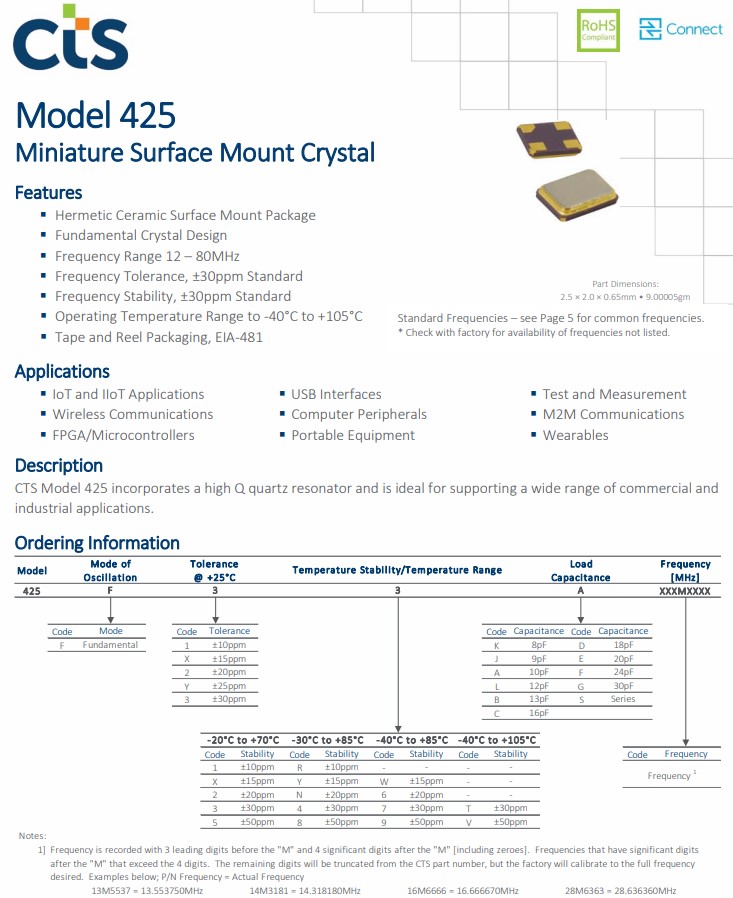 | 425F11K025M0000 | CTS晶振 | 425 | MHz Crystal | 25MHz | 4-SMD, No Lead |