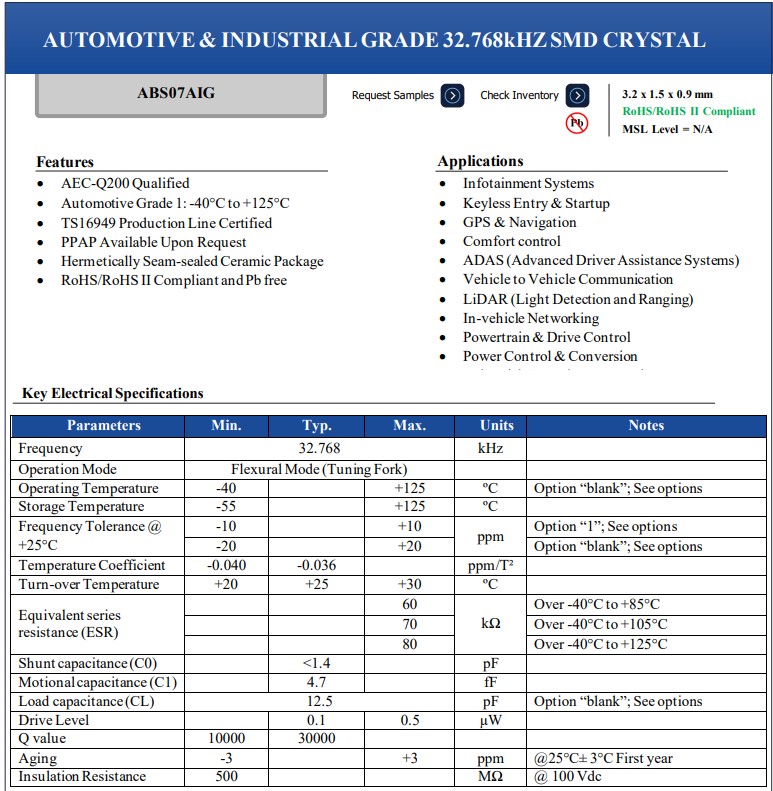 Abracon晶振ABS07AIG是一種高溫石英晶體,小體積尺寸3.2x1.5mm兩腳貼片晶振,32.768K晶振,石英晶體諧振器,通過AEC-Q200認證,并通過TSI6949生產(chǎn)線認證。該器件具有-40°C至+125°C的寬工作溫度范圍,是極端環(huán)境下商業(yè)或工業(yè)應(yīng)用的完美解決方案。憑借超薄的外形,無源晶振ABS07AIG可以在空間受限的設(shè)計中實現(xiàn),如可穿戴設(shè)備或車輛的信息娛樂系統(tǒng)。這種石英晶體采用密封的陶瓷封裝,在導(dǎo)航,智能手機,無線通信,車載晶振等應(yīng)用中具有長期可靠性。與其ABS07系列類似,automotive系列可以執(zhí)行低至10ppm的嚴格頻率穩(wěn)定度,以確保其時間管理精確無誤。雖然ABS07AIG系列可以執(zhí)行額外的要求,但它針對低功耗進行了優(yōu)化,以延長電池壽命,因此非常適合各種應(yīng)用。汽車導(dǎo)航專用石英晶體ABS07AIG-32.768KHZ-D-T