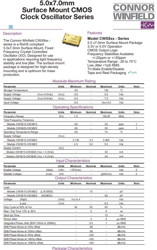 Connor-Winfield CWX8xx -該系列產(chǎn)品符合RoHS要求5.0x7.0mm表面安裝,固定晶體頻率控制時鐘晶體振蕩器(XO)。設(shè)計用于適用于頻率要求較緊的場合穩(wěn)定性好,抖動小。表面安裝包裝為高密度設(shè)計安裝和是最佳質(zhì)量生產(chǎn)。