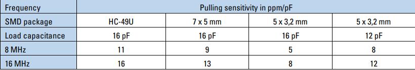 表2:不同尺寸振蕩晶體的拉靈敏度,負載電容與本設(shè)計中的典型值相對應(yīng)。