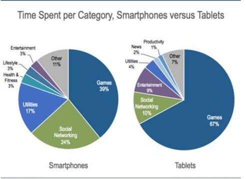 無論在平板電腦還是智能手機平臺上,游戲都是使用最多的應用,在平板電腦中占67%,在智能手機中占39%。不過這進一步證明,平板電腦是一種“媒體工具”。消費者在平板電腦上玩游戲的頻率比智能手機上多71%。