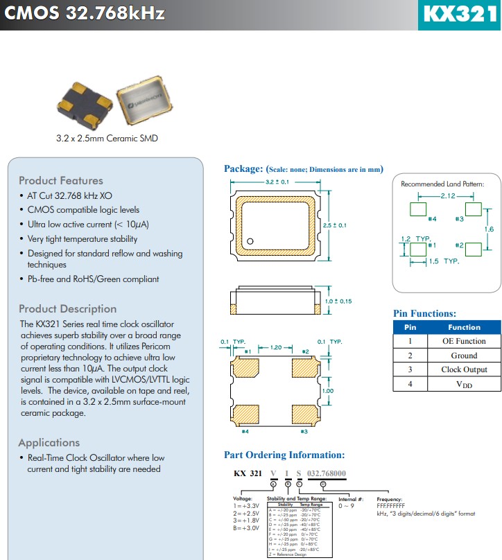 KX321系列實時時鐘振蕩器在廣泛的工作條件下實現(xiàn)了卓越的穩(wěn)定性。1.8V/2.5V/3.3V, 小體積晶振尺寸3.2x2.5mm, 32.768k,CMOS晶體振蕩器,它利用Pericom專有技術(shù)實現(xiàn)小于10μA的超低電流。輸出時鐘信號與 LVCMOS/LVTTL 邏輯電平兼容。該器件采用卷帶包裝,采用3.2x2.5mm表面貼裝陶瓷封裝。