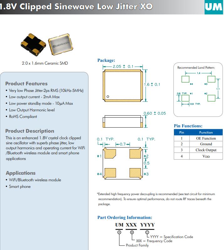 這是一個增強的1.8V水晶時鐘剪接正弦有源晶體振蕩器具有高超的相位抖動,低輸出諧波和工作電流為WiFi/藍牙無線模塊和智能手機應用程序
