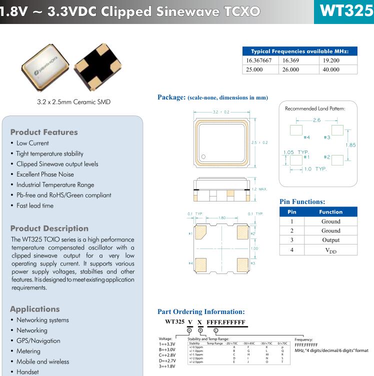 | WT325CF0019.200000 | Diodes晶振 | SaRonix-eCera™ WT | 19.2MHz | ±500ppb | -30°C ~ 85°C |