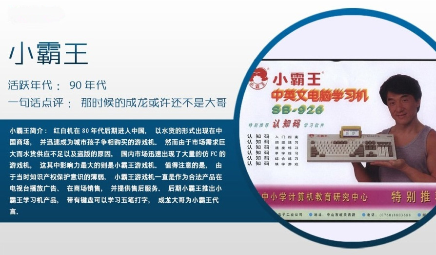 小霸王游戲機(jī)一聽就很熟悉吧,在那個(gè)年特別火,而且是于成龍代言的,那時(shí)候的成龍或許還不是大哥,小霸王游戲機(jī)一直是作為合法產(chǎn)品在電視臺(tái)播放廣告、在商場(chǎng)銷售,并提供售后服務(wù)。后期小霸王推出小霸王學(xué)習(xí)機(jī)產(chǎn)品,帶有鍵盤可以學(xué)習(xí)五筆打字,成龍大哥為小霸王代言。
