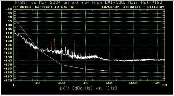 馬可尼2024現在設置為使用外部基準電壓源.另一個CFS10B-03用作外部基準電壓源. 相位噪聲的測量方法與以前完全相同.