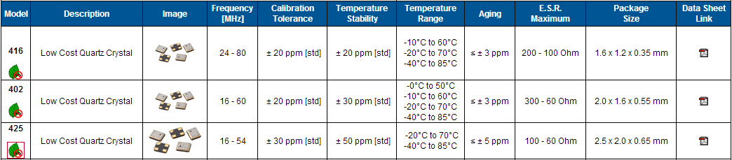 | 頻率公差25℃ | ±20 ppm, ±30 ppm, ±50 ppm | |
