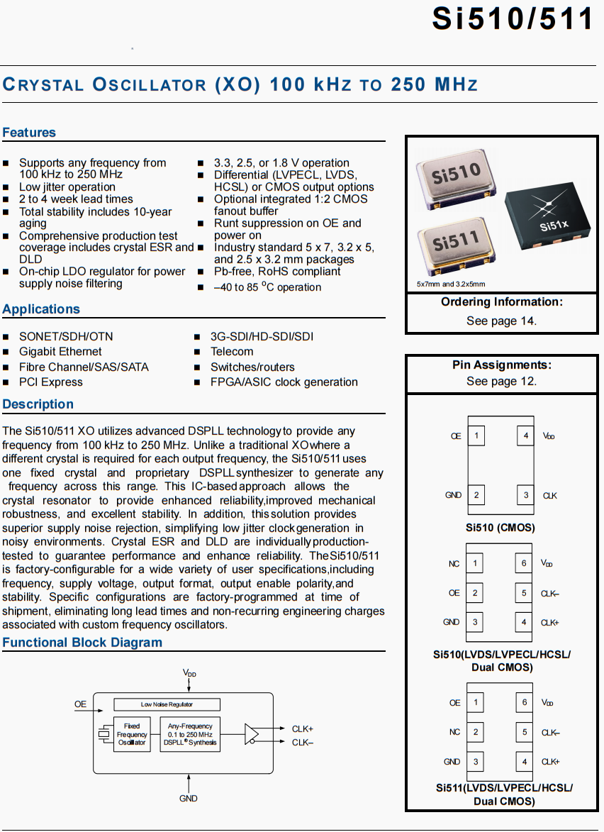 特點(diǎn):支持任何從100 kHz頻率250 MHz,低抖動(dòng)操作,2到4周交貨期,總體穩(wěn)定包括10年老化,全面生產(chǎn)測(cè)試覆蓋包括水晶ESR和DLD,芯片上的LDO穩(wěn)壓器電源噪聲過(guò)濾,3.3,2.5,和1.8 V操作,差分晶振(LVPECL、LVDS HCSL)或CMOS輸出選項(xiàng),可選的集成1:2 CMOS分列緩沖區(qū),小牛抑制OE和力量上,行業(yè)標(biāo)準(zhǔn)5 x 7, 3.2 x 5和2.5 x 3.2毫米的軟件包,無(wú)鉛,符合RoHS標(biāo)準(zhǔn),-40至85℃工作